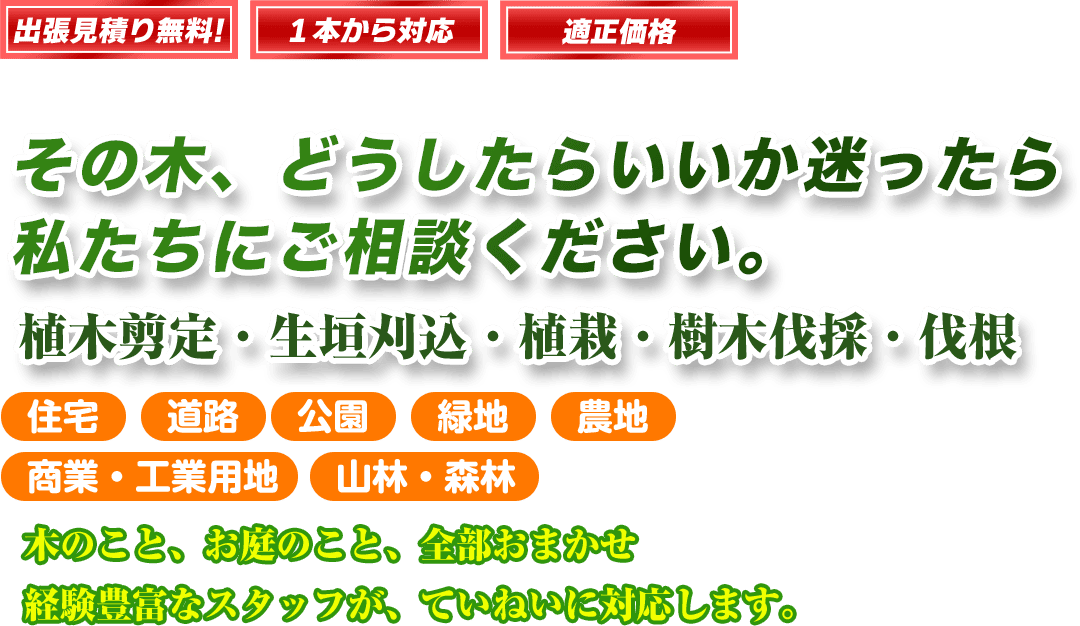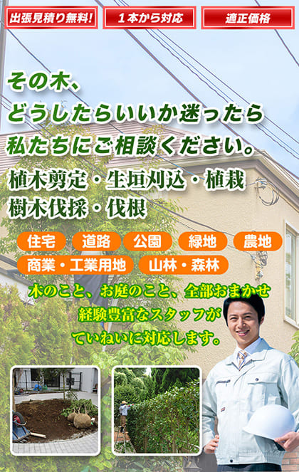 木の高さやまわりの状況を見て、ムリのない方法で作業できるよう、ぴったりのプランをご提案します。大木や高木の作業は、きちんとしたお見積りが必要になりますので、まずはお気軽にお電話でご相談くださいね。