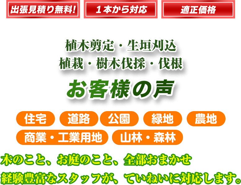 大木や高木の伐採は、正確なお見積りが必要になりますので、まずはお気軽にお電話でご相談くださいね。